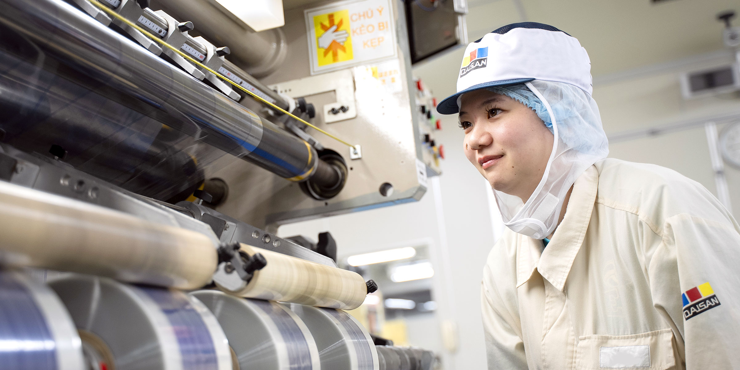 当社では、クリーンルーム化によるクラス10,000の清浄度を備えた印刷棟や、人と原材料の出入り口の完全分離など、あらゆる方向からの異物混入リスクを厳密に管理。また、業界団体の認定工場として、安全確保を最優先に考えた製造を行っています。