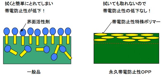 今までの帯電防止タイプセパに比較して、表面への帯電防止材のブリードがないため、帯電防止効果が落ちません。また、湿度依存性も少ないOPPフィルムセパレータが出来る様になりました。